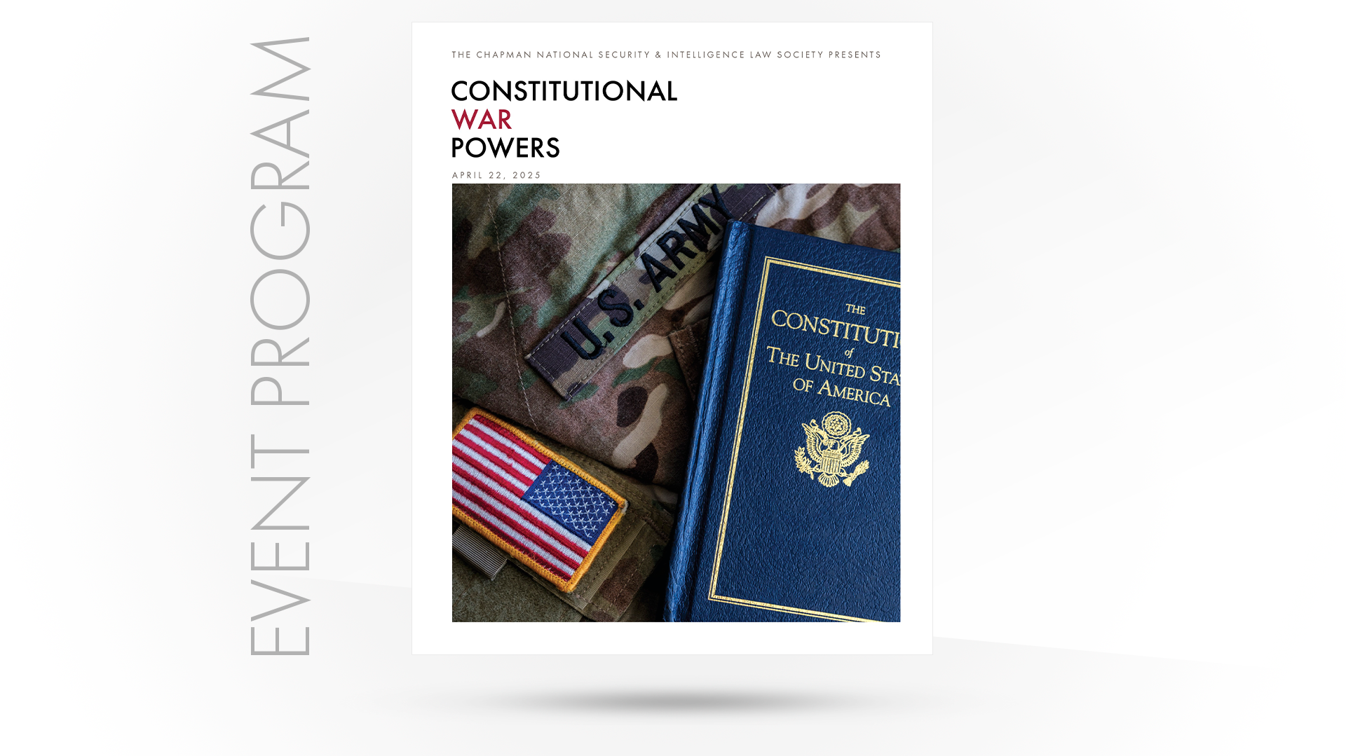 Prioritizing design time for student-led events is a commitment I try to keep during the semester, which is not always possible. One of the student-founders of a newly formed law society, The Chapman National Security & Intelligence Law Society,” approached me for help with this event and an idea of his own: A photograph of his personal copy of The Pocket Constitution, nestled in an army uniform (his again).