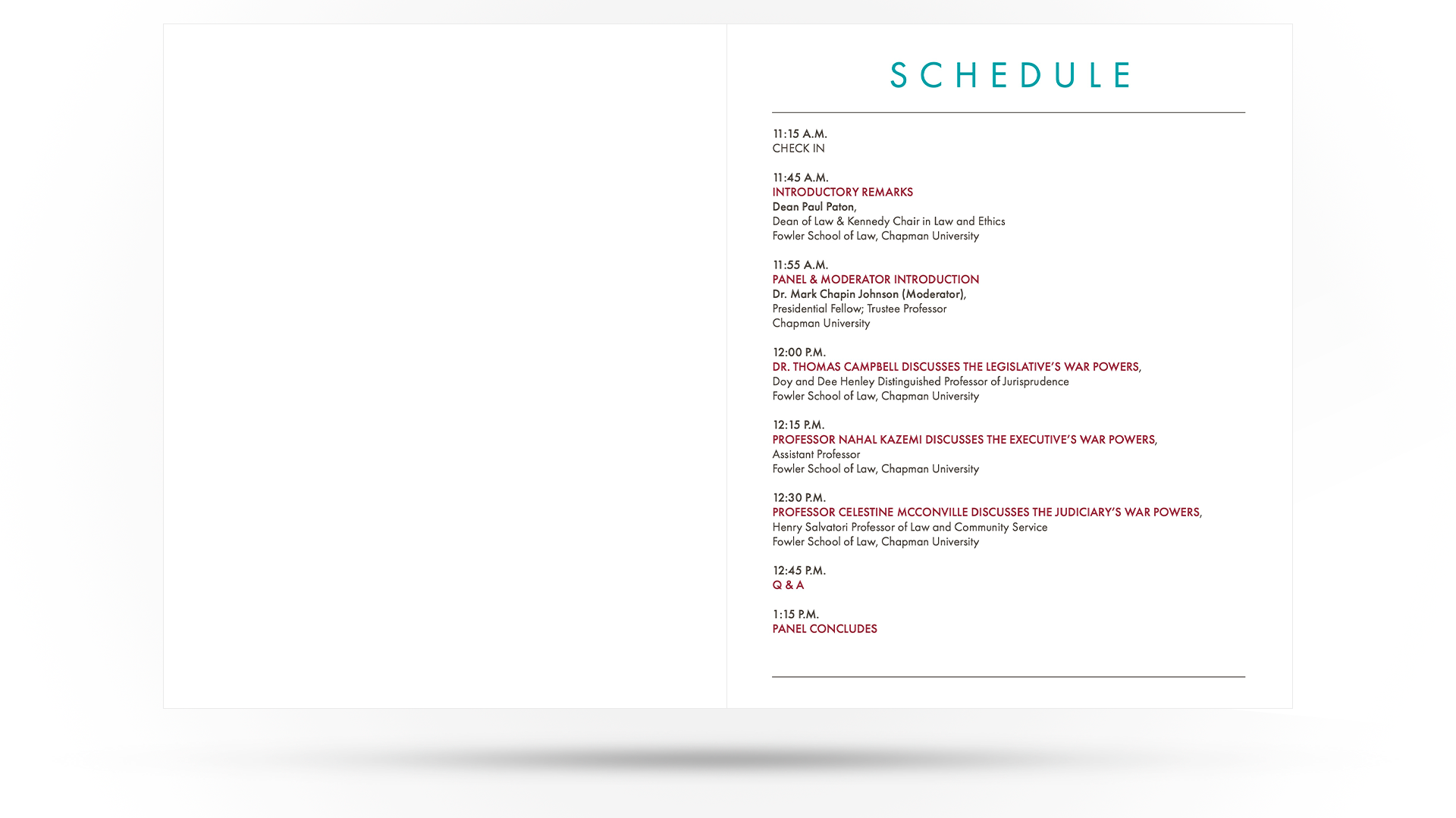 This discussion panel program is a design I have repurposed again and again. It’s clean, modern and perfect for a law school – printed on an oversized piece of paper, commonly called “legal” (as opposed to “letter”). Folded in half, this common page size gives this discussion panel media an almost square 8 x 7-inch canvas and a very versatile grid structure.