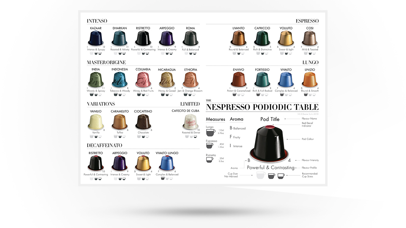 The original idea behind the table was to create an A3-sized page that presented all the Nespresso coffee pods at a glance. I needed to be able to see the flavor profile and intensity of each pod at a glance, and without having to resort to Nescafe’s little book. The simplest solution was to create a periodic–or “podiodic” table. Print it, laminate it and stick it up inside the cupboard above your Nespresso altar.
